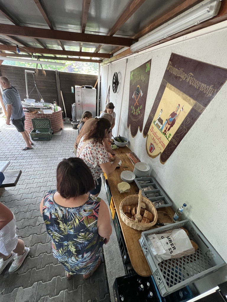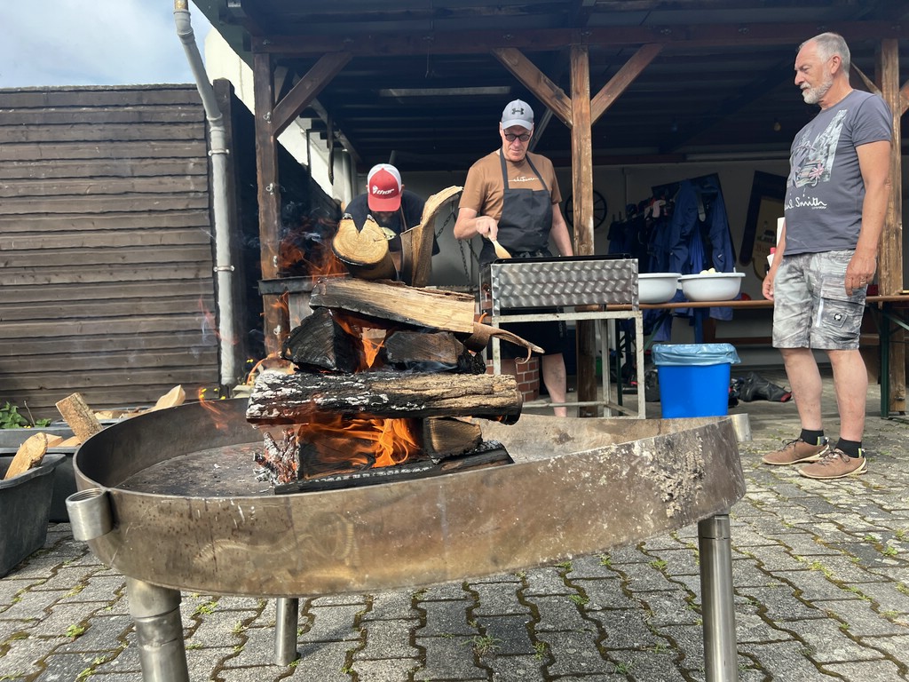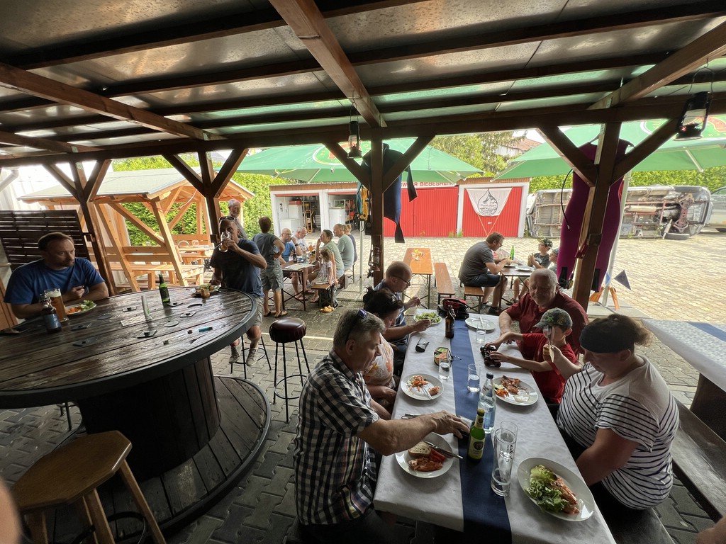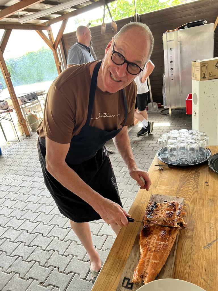 Bei strahlendem Sonnenschein liess man es sich unter den Sonnenschirmen gutgehen und Flammlachs, Hackklösse mit Zwiebelsosse und Rosmarinkartoffeln, Currywurst und Salate schmecken.