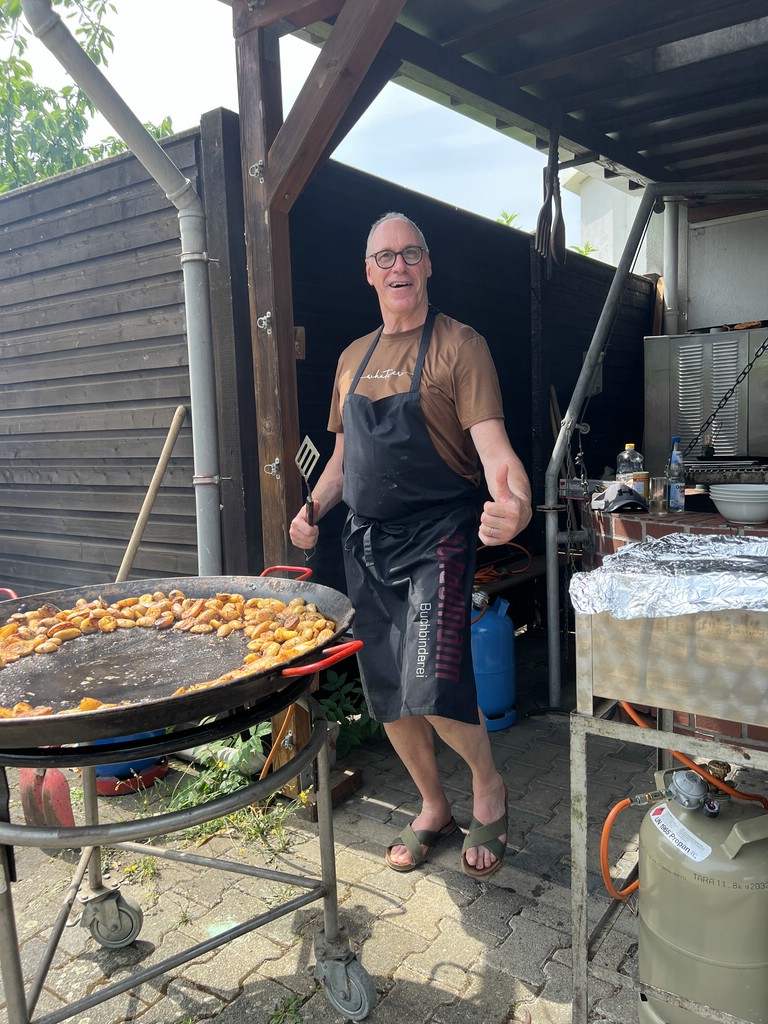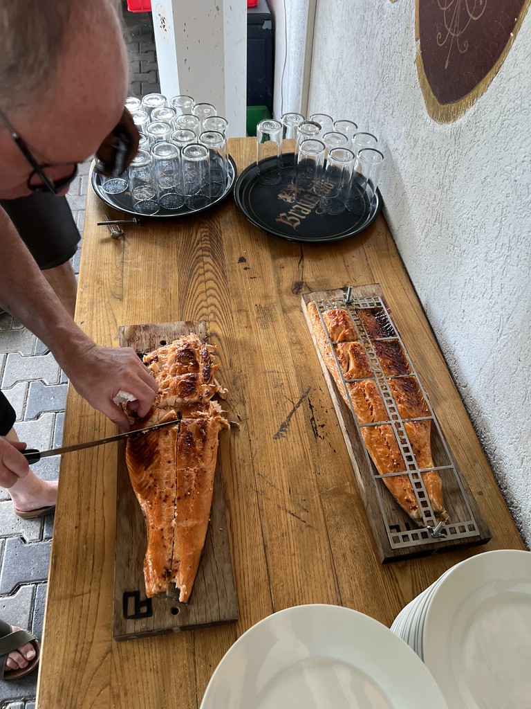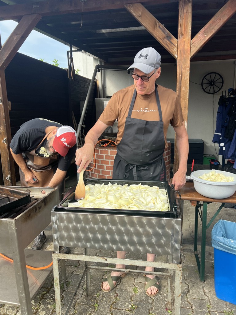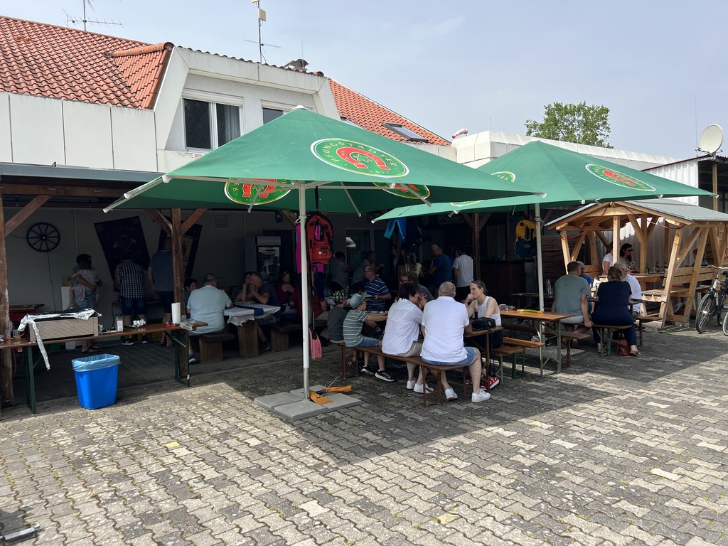 Bei strahlendem Sonnenschein liess man es sich unter den Sonnenschirmen gutgehen und Flammlachs, Hackklösse mit Zwiebelsosse und Rosmarinkartoffeln, Currywurst und Salate schmecken.