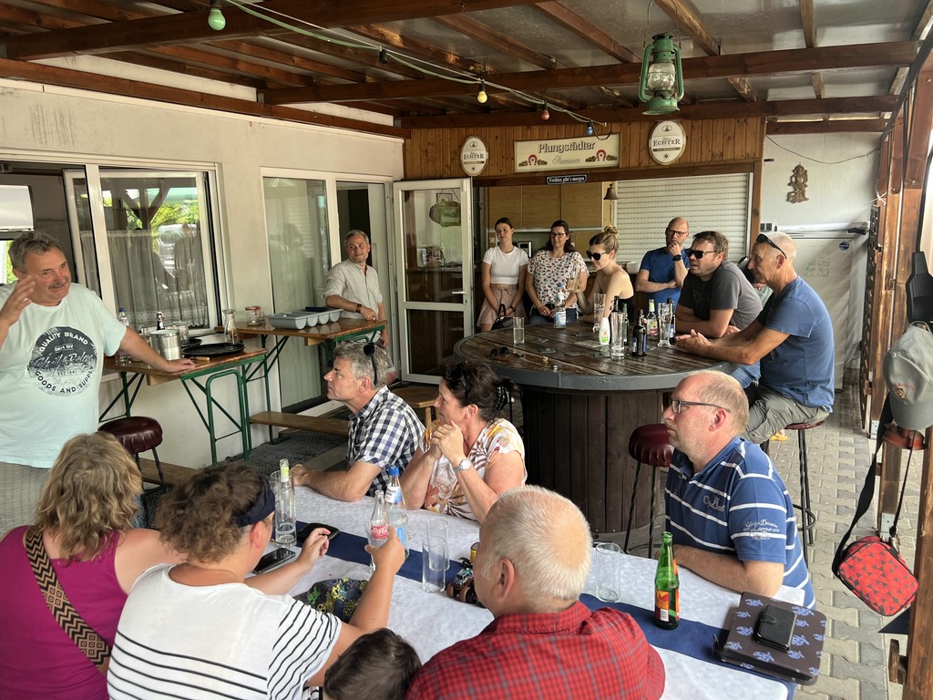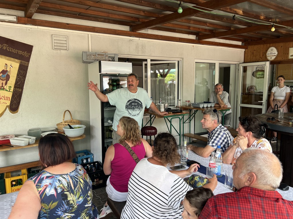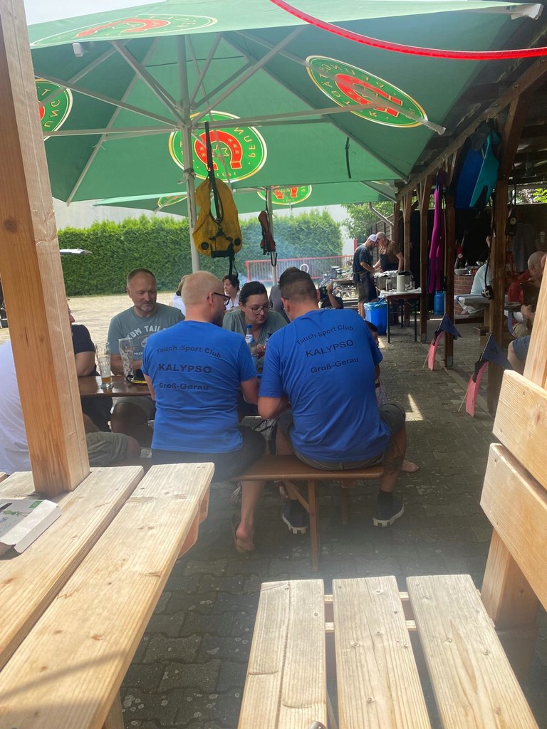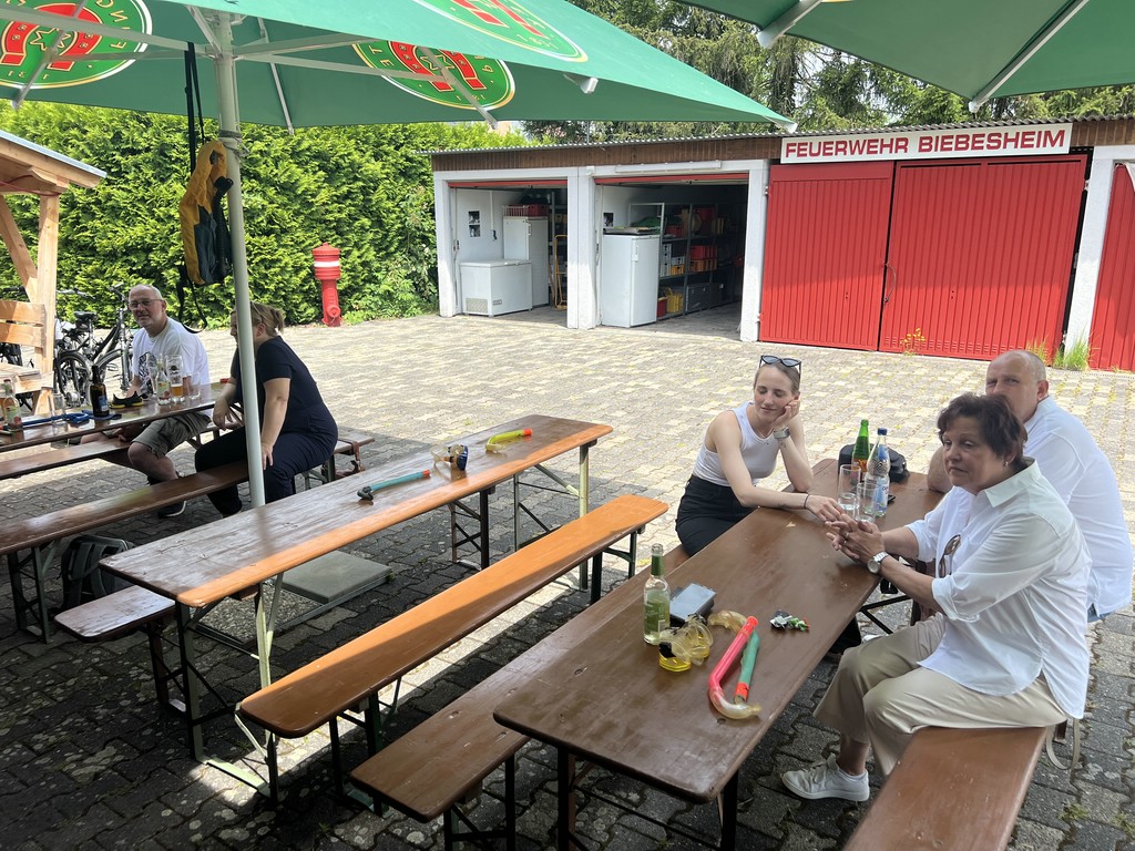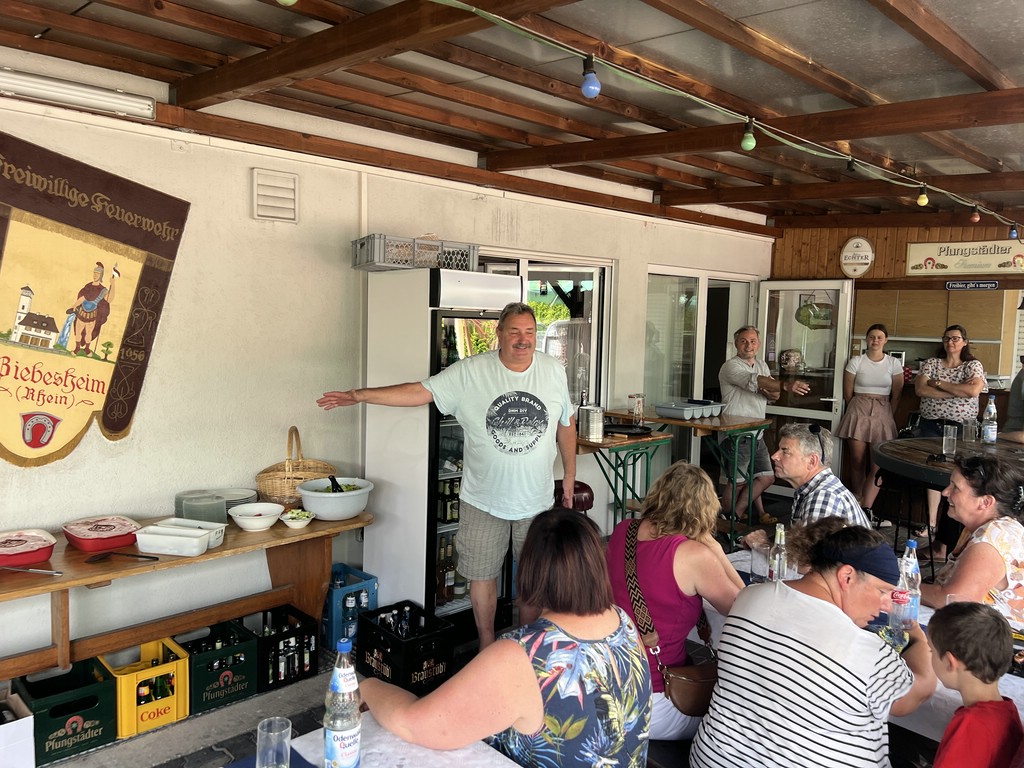 Ab 11:30 trafen sich die mittlerweile wieder aufgtauchten Taucher und weitere Mitglieder mit ihren Familien im Hof der Feuerwehr Biebesheim zu Aperetif, Prosseco und Dekobier. Die Dekoration, bestehend aus Tauchausrüstungen der letzten 40 Jahre, liess Erinnerungen an die Anfangzeit aufleben, als man noch mit "Klodeckeln" getaucht ist. Mit Werner Wick war sogar eines der Gründungsmitglieder unter den Feiernden.